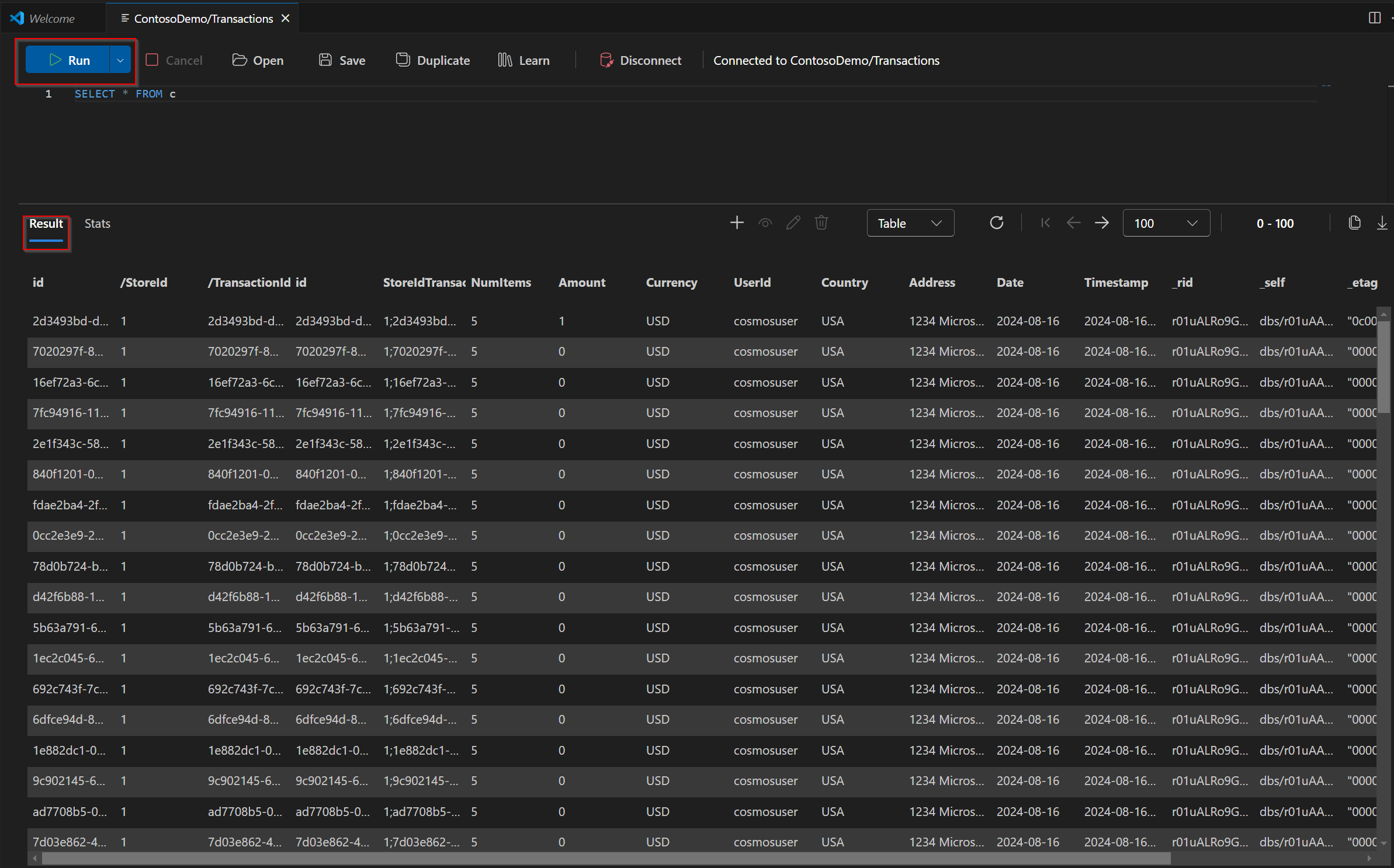 Execute a consulta fornecida no editor de consultas para exibir seus dados no Modo de Exibição de Tabela: