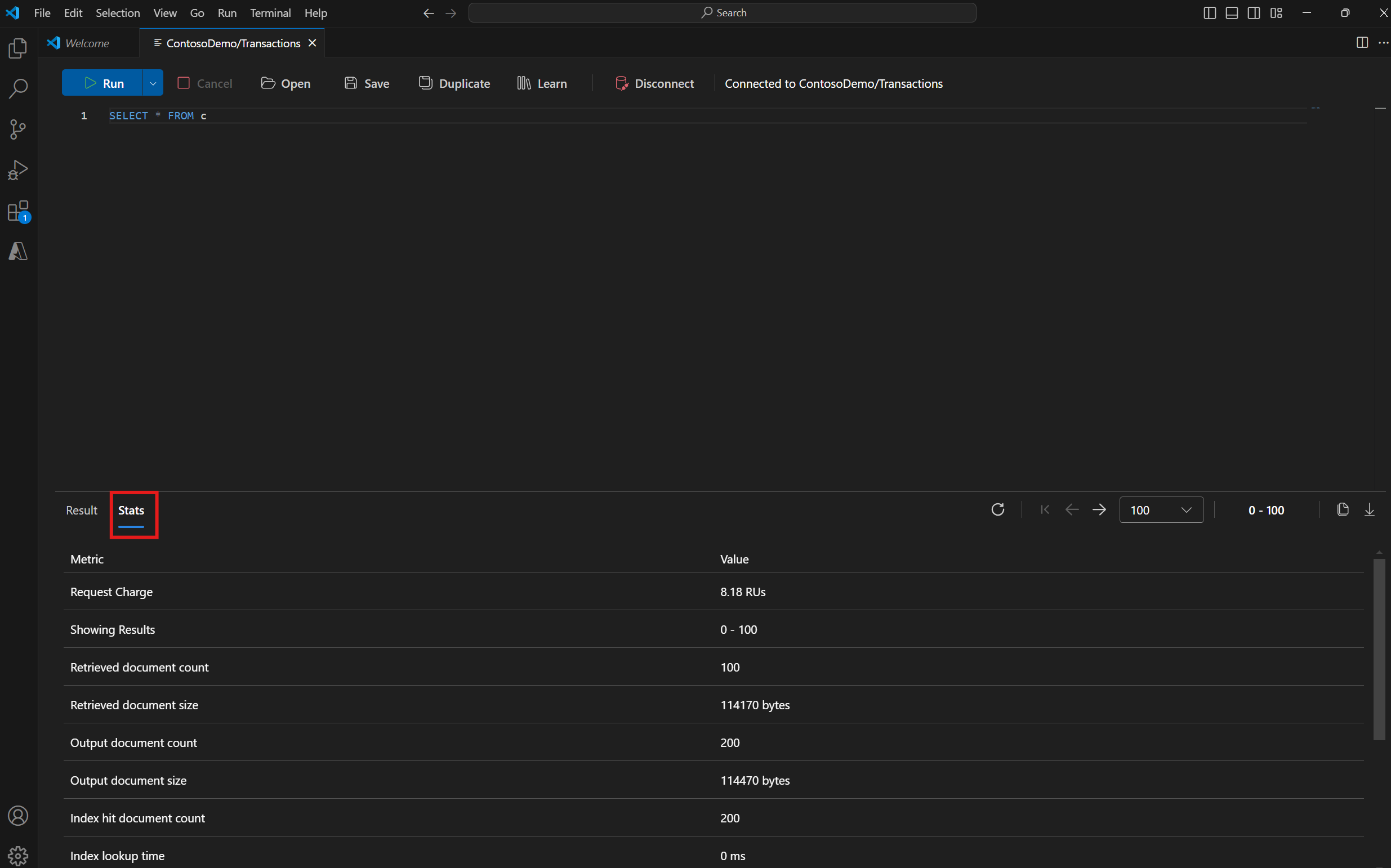 No editor de consultas, visualize mais métricas de consulta e índice para ajudar a otimizar o desempenho da consulta.