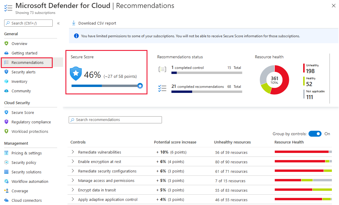 O Defender for Cloud exibe sua pontuação em destaque no portal. Ao selecionar o bloco de pontuação segura na página de visão geral, você será direcionado para a página de pontuação segura dedicada, onde verá a pontuação dividida por assinatura. Selecione uma única assinatura para ver a lista detalhada de recomendações priorizadas e o efeito potencial que corrigi-las terá na pontuação da assinatura.