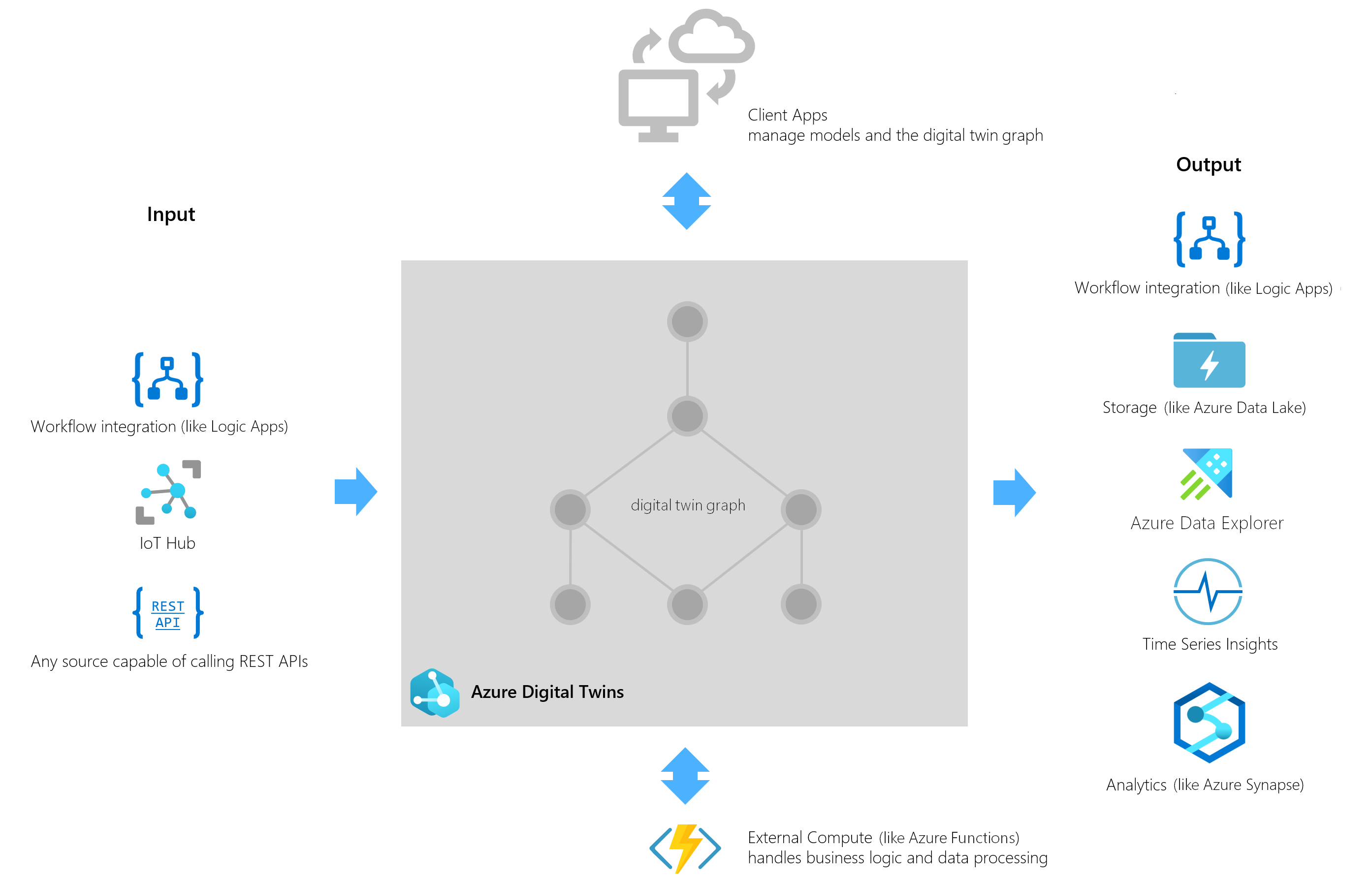 - Um ou mais aplicativos cliente que conduzem a instância do Azure Digital Twins configurando modelos, criando topologia e extraindo insights do gráfico gêmeo.