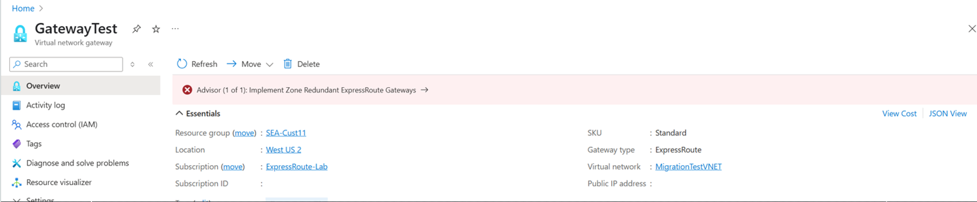 O Azure Advisor irá notificá-lo se o seu gateway for elegível ou necessitar de migração. Você também pode verificar o seu recurso de ExpressRoute Gateway no portal do Azure — se o seu gateway estiver qualificado, um banner na parte superior da página exibirá a mensagem "Implementar Gateways ExpressRoute Redundantes de Zona."