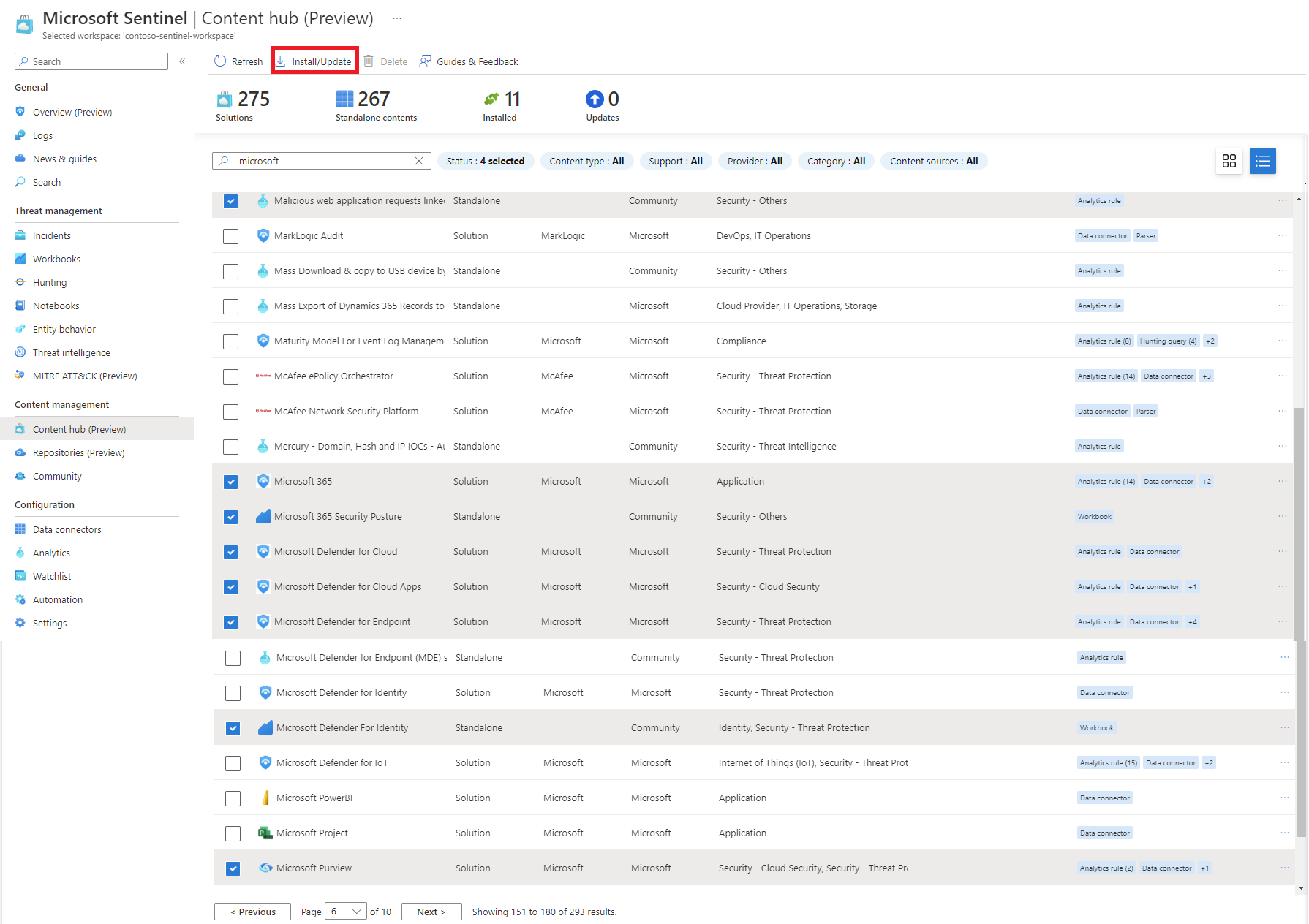 O hub de conteúdo do Microsoft Sentinel é o local centralizado para descobrir e gerenciar conteúdo pronto para uso (embutido). Lá você encontra soluções empacotadas para produtos de ponta a ponta por domínio ou indústria. Você tem acesso a muitas contribuições independentes hospedadas em nosso repositório GitHub e elementos de funcionalidades.