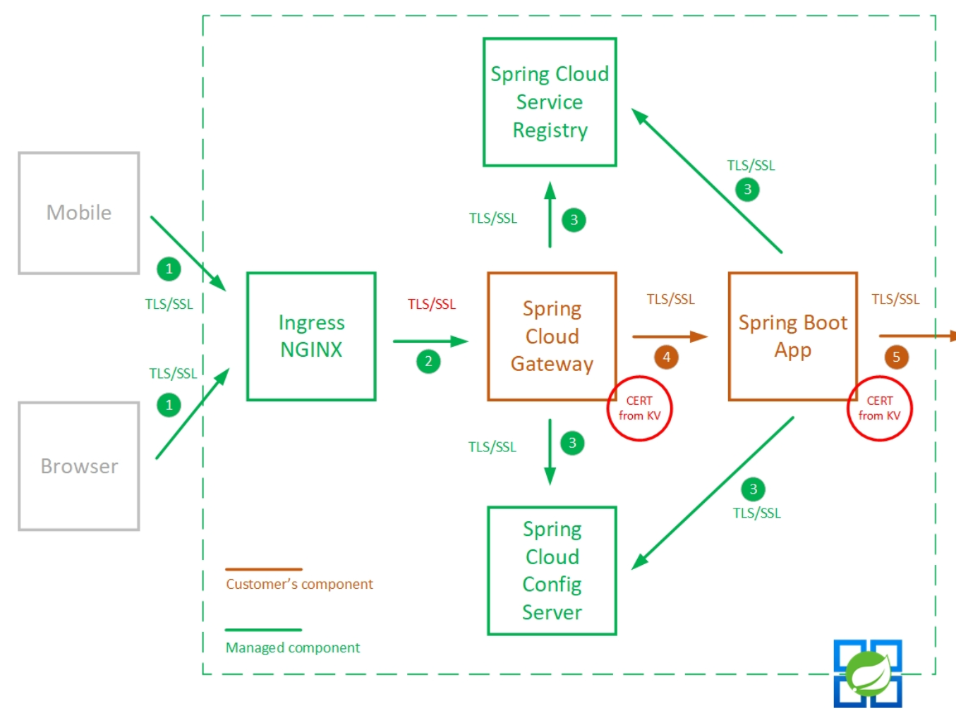 A imagem a seguir mostra o suporte geral de comunicação segura no Azure Spring Apps.
