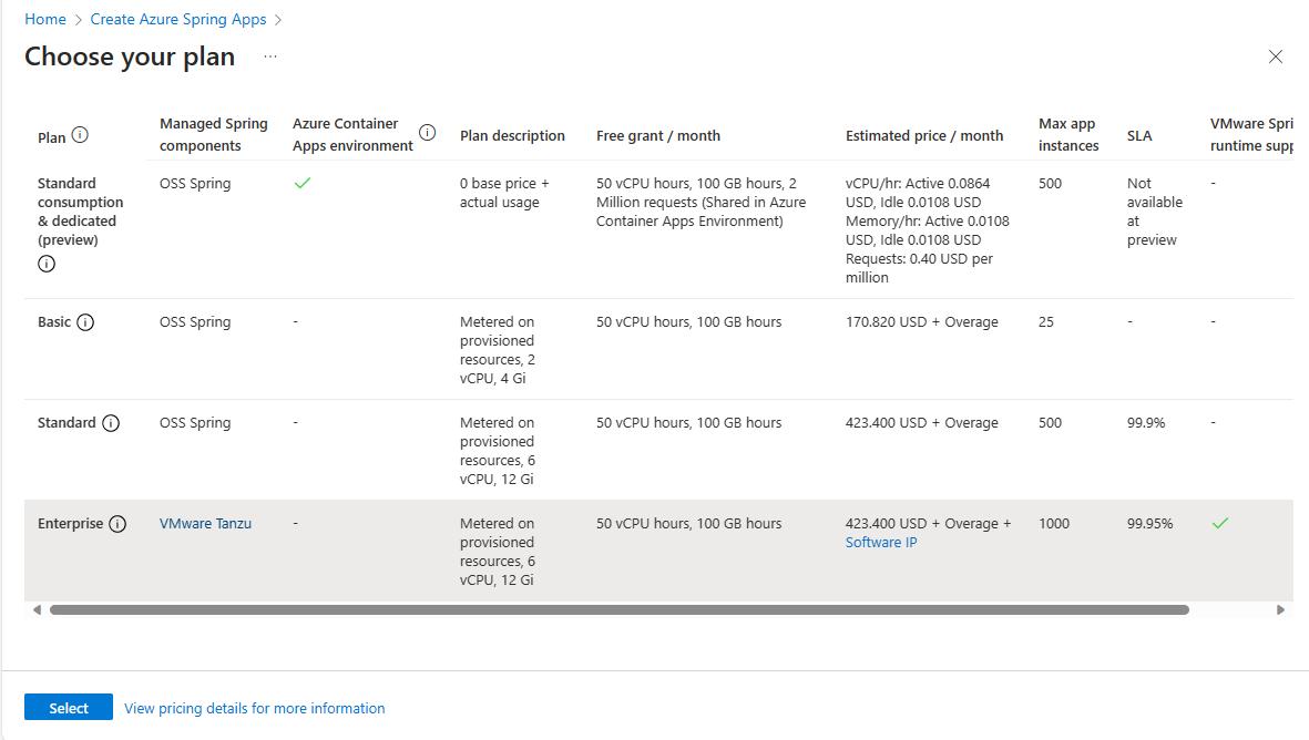 Os planos Basic, Standarde Enterprise entraram em um período de aposentadoria em 17 de março de 2025. Para obter mais informações, consulte o anúncio de aposentadoria do Azure Spring Apps.