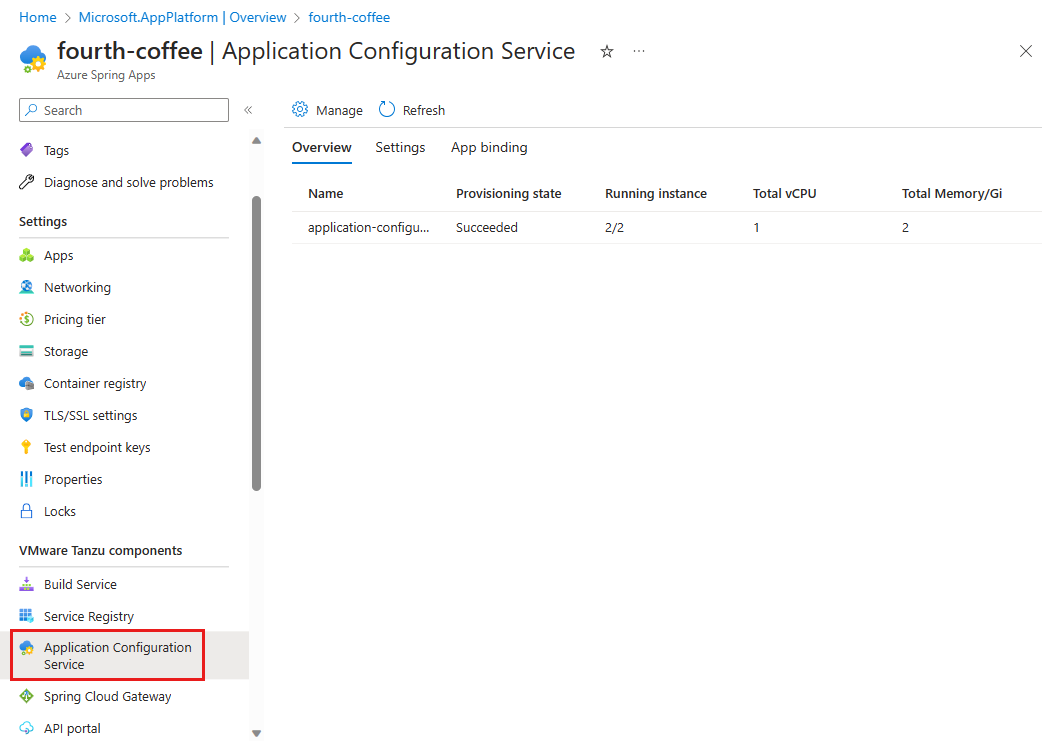 Na sua instância do Azure Spring Apps Enterprise, selecione Serviço de Configuração de Aplicativo no painel de navegação. Exiba o estado de execução e os recursos alocados ao Serviço de Configuração de Aplicativo para Tanzu.