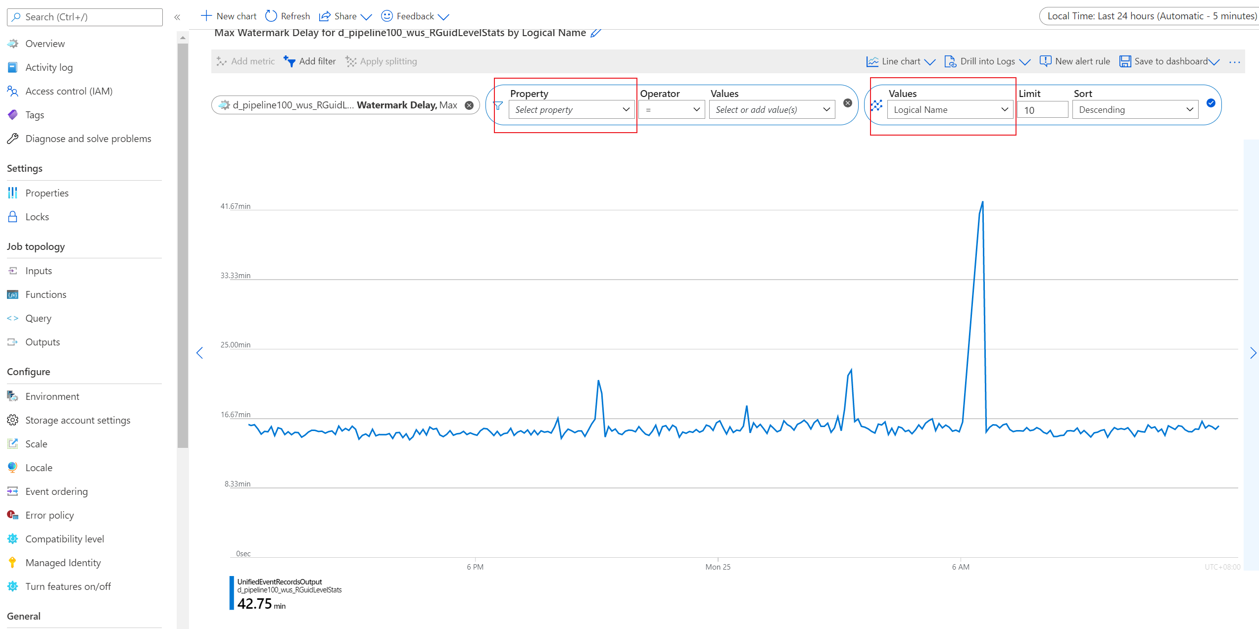 Nome lógico é o nome de entrada ou saída de um trabalho do Stream Analytics. Por exemplo, suponha que um trabalho do Stream Analytics tenha quatro entradas e cinco saídas. Você verá as quatro entradas lógicas individuais e as cinco saídas lógicas individuais quando dividir as métricas relacionadas à entrada e à saída por essa dimensão.