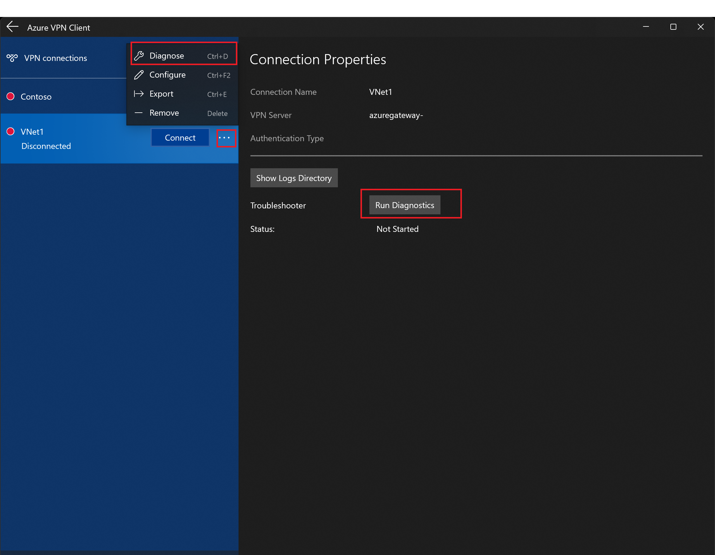 Selecione o botão ... ao lado da conexão VPN que você deseja diagnosticar para revelar o menu. Em seguida, selecione Diagnosticar.