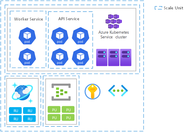 Todos os aspetos funcionais de uma solução devem ser capazes de escalar para se ajustarem às alterações na procura, idealmente escalamento automático em resposta à carga. Recomendamos que você use uma arquitetura de unidade de escala para otimizar a escalabilidade de ponta a ponta por meio da compartimentação e também para padronizar o processo de adição e remoção de capacidade. Uma unidade de escala é uma unidade lógica ou função que pode ser dimensionada independentemente. Uma unidade pode ser composta por componentes de código, plataformas de hospedagem de aplicações, os carimbos de implantação que cobrem os componentes relacionados, e até mesmo subscrições para dar suporte a requisitos multi-inquilino.