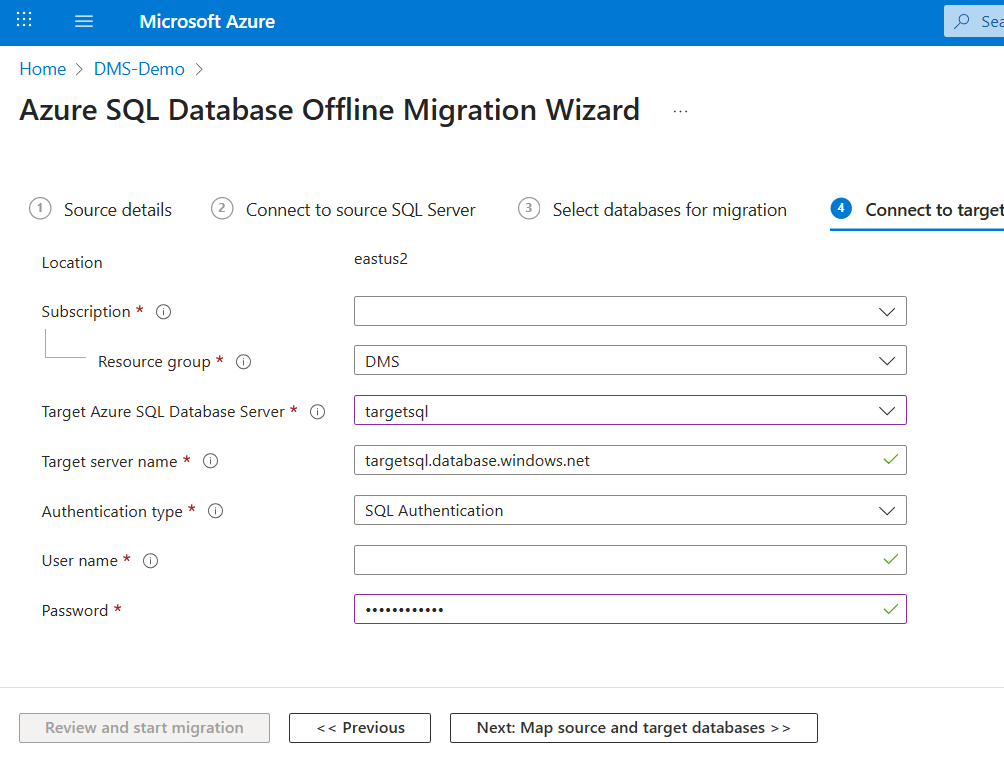 Na Etapa 3: destino SQL do Azure no assistente Migrar para o Azure SQL, conclua as seguintes etapas para sua instância de destino do Banco de Dados SQL do Azure: