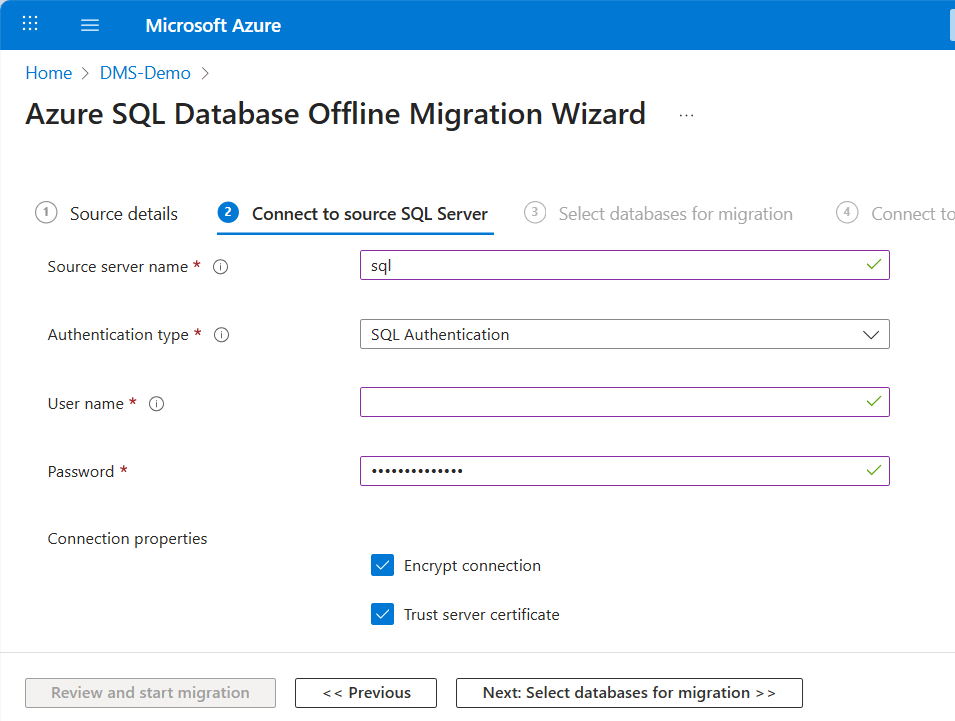 Em Credenciais de origem, insira as credenciais do SQL Server de origem.