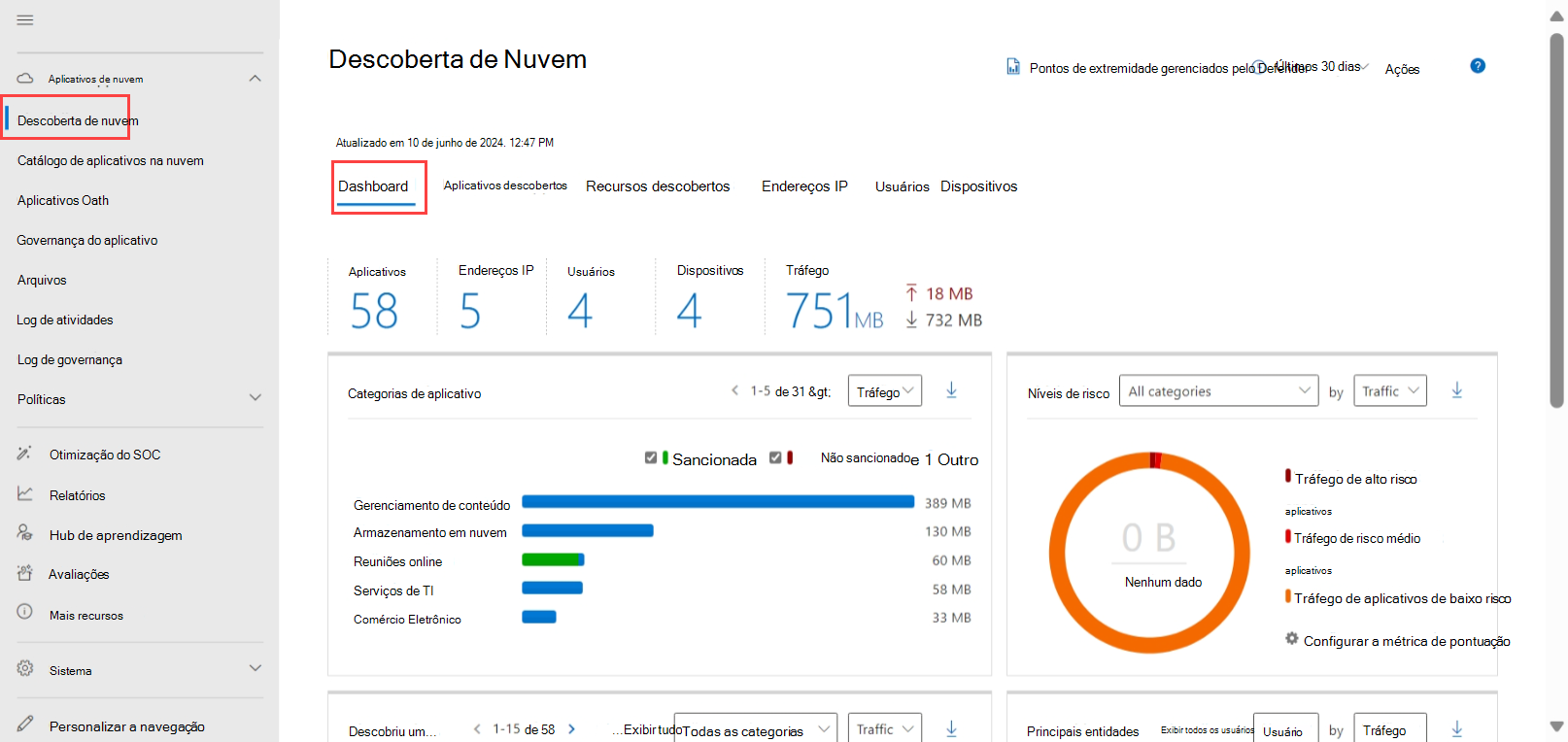 No portal Microsoft Defender, em Cloud Apps, selecione Cloud Discovery. Em seguida, selecione o separador Recursos detetados .