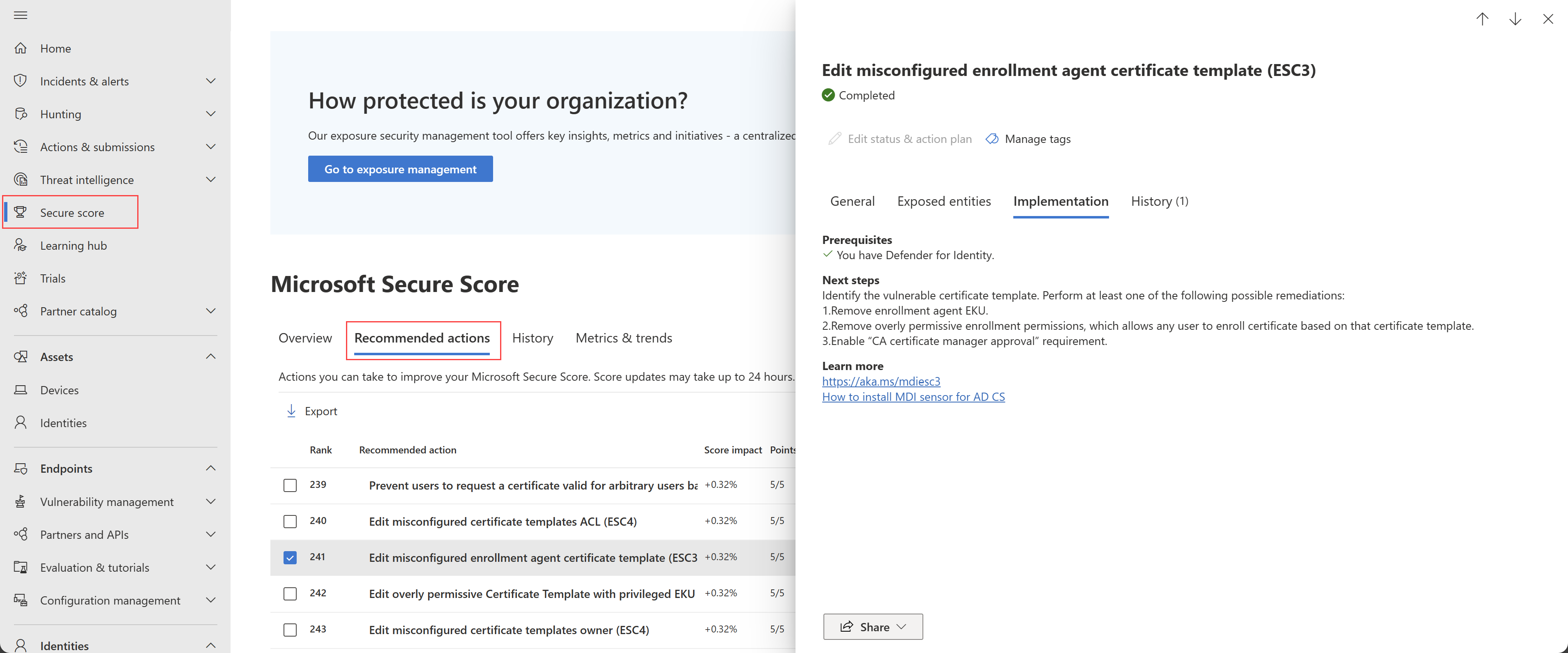 Reveja a ação recomendada em https://security.microsoft.com/securescore?viewid=actions para obter modelos de certificados do agente de inscrição configurados incorretamente. Por exemplo: