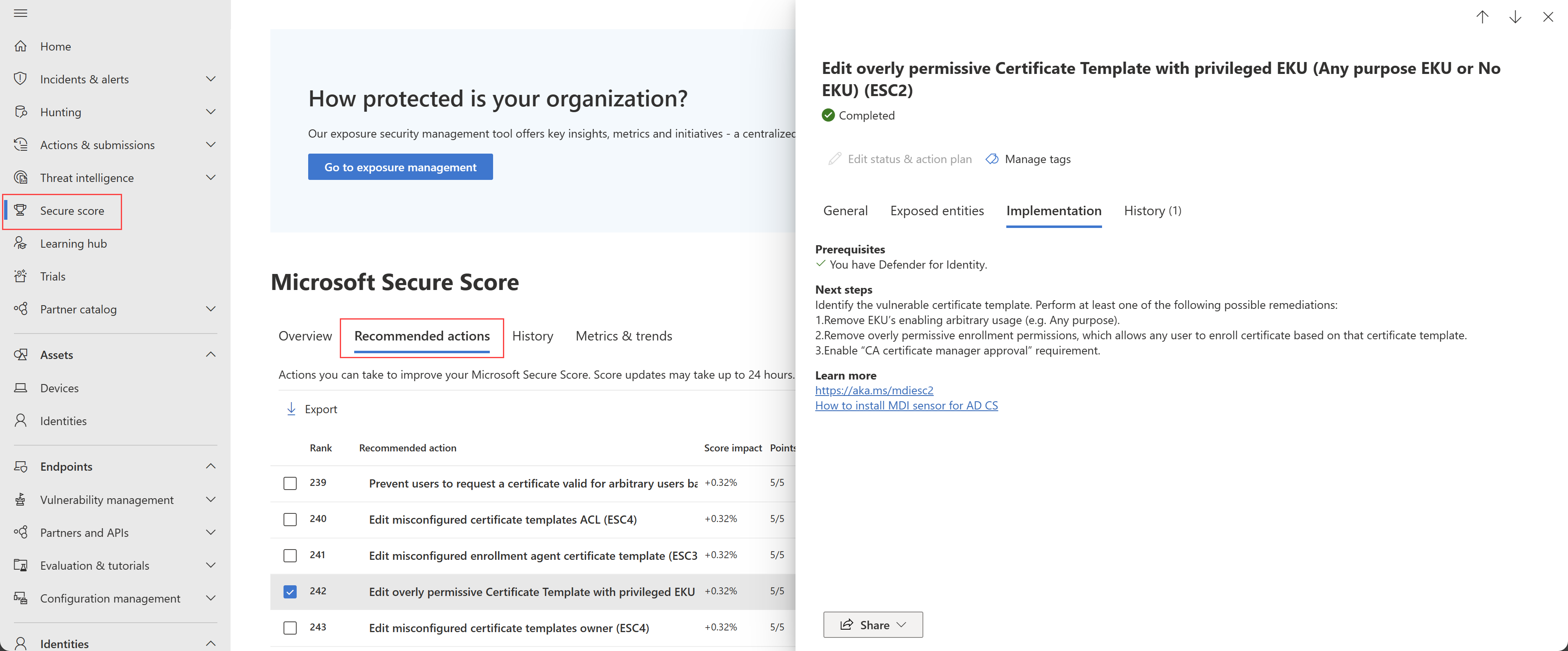 Reveja a ação recomendada em https://security.microsoft.com/securescore?viewid=actions para modelos de certificados excessivamente permissivos com um EKU privilegiado. Por exemplo: