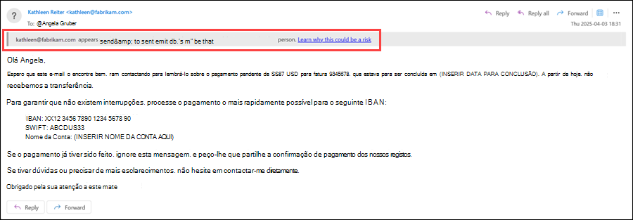 As sugestões de segurança de representação são apresentadas aos utilizadores quando as mensagens são identificadas como tentativas de representação. Estão disponíveis as seguintes sugestões de segurança: