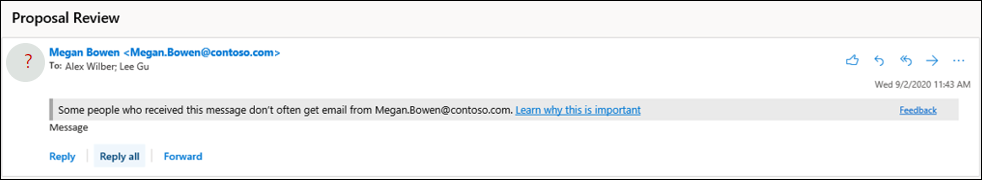 Por exemplo, Gabriela Laureano (glaureano@contoso.com) é a CEO da sua empresa, pelo que a adiciona como remetente protegido na política Permitir que os utilizadores protejam as definições da política. No entanto, alguns dos destinatários da política comunicam regularmente com um fornecedor que também se chama Gabriela Laureano (glaureano@fabrikam.com). Uma vez que esses destinatários têm um histórico de comunicações com glaureano@fabrikam.como , as informações da caixa de correio não identificam as mensagens de glaureano@fabrikam.com como uma tentativa de representação desses glaureano@contoso.com destinatários.