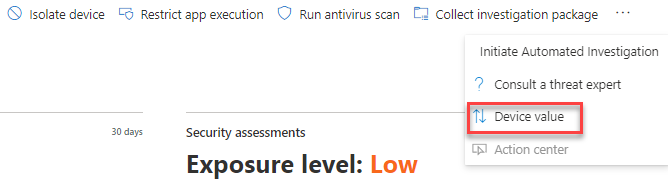 Definir o valor de um dispositivo ajuda-o a diferenciar entre prioridades de ativos. O valor do dispositivo é utilizado para incorporar o apetite pelo risco de um recurso individual no cálculo da pontuação de exposição Gestão de vulnerabilidades do Defender. Os dispositivos atribuídos como "valor elevado" recebem mais peso.