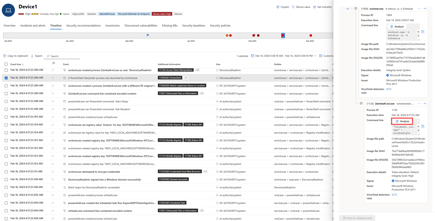 Em alternativa, pode selecionar um evento para inspecionar na vista de linha cronológica do dispositivo. No painel de detalhes do ficheiro, selecione Analisar para executar a capacidade de análise de scripts.
