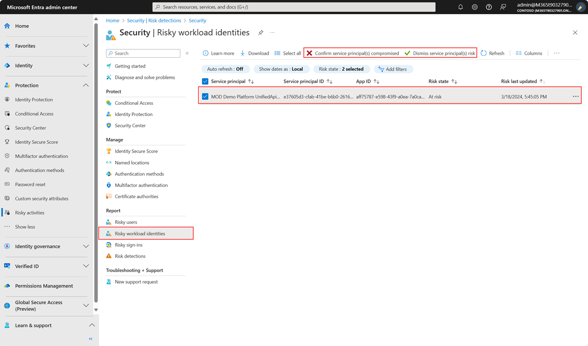 Depois de determinar se a identidade da carga de trabalho foi comprometida, você deve descartar o risco da conta ou confirmar a conta como comprometida no relatório de identidades de carga de trabalho de risco. Você também pode selecionar "Desativar principal de serviço" se quiser impedir que a conta faça mais logins.