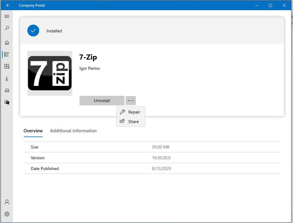 O separador Overview mostra detalhes sobre a aplicação, como tamanho, versão e data publicada.