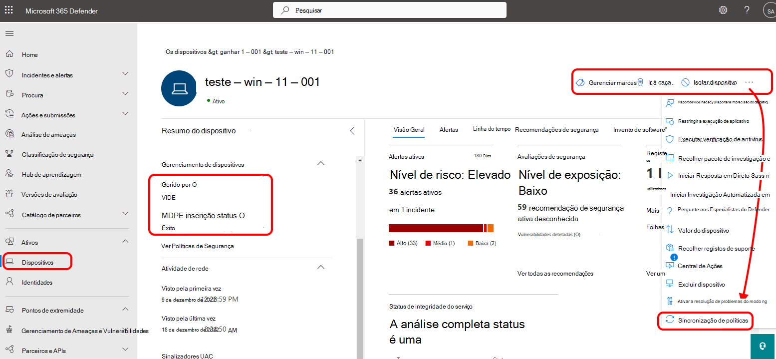 Você pode sincronizar manualmente um dispositivo sob demanda no portal do Microsoft Defender. Entre no portal e vá para Dispositivos. Selecione um dispositivo gerenciado pelo Microsoft Defender para Ponto de Extremidade e, em seguida, selecione o botão Sincronização de política: